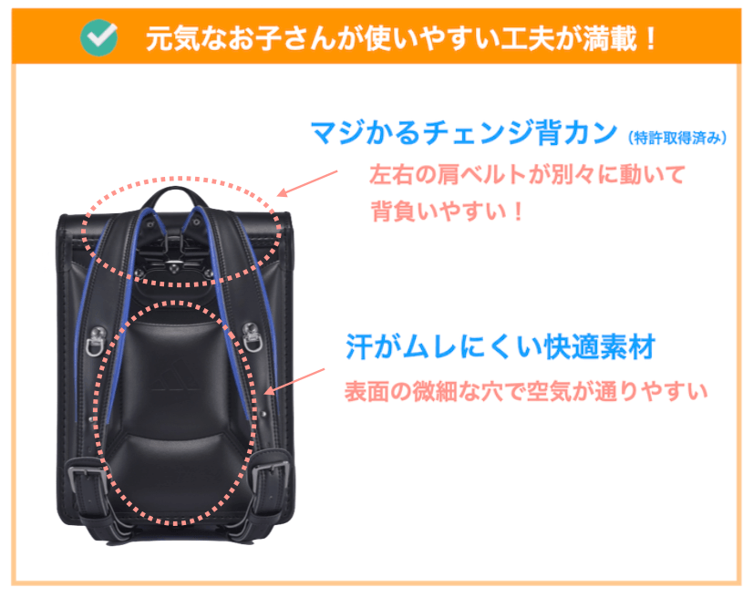アディダスのランドセルは、ランドセルを背負ったまま元気に走り回るお子さんをサポートするための様々な工夫がされています。