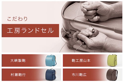 「こだわりの工房系ランドセル」は、デザイン、使いやすさ、丈夫さなど、職人がこだわり抜いたランドセルを取り扱っています。