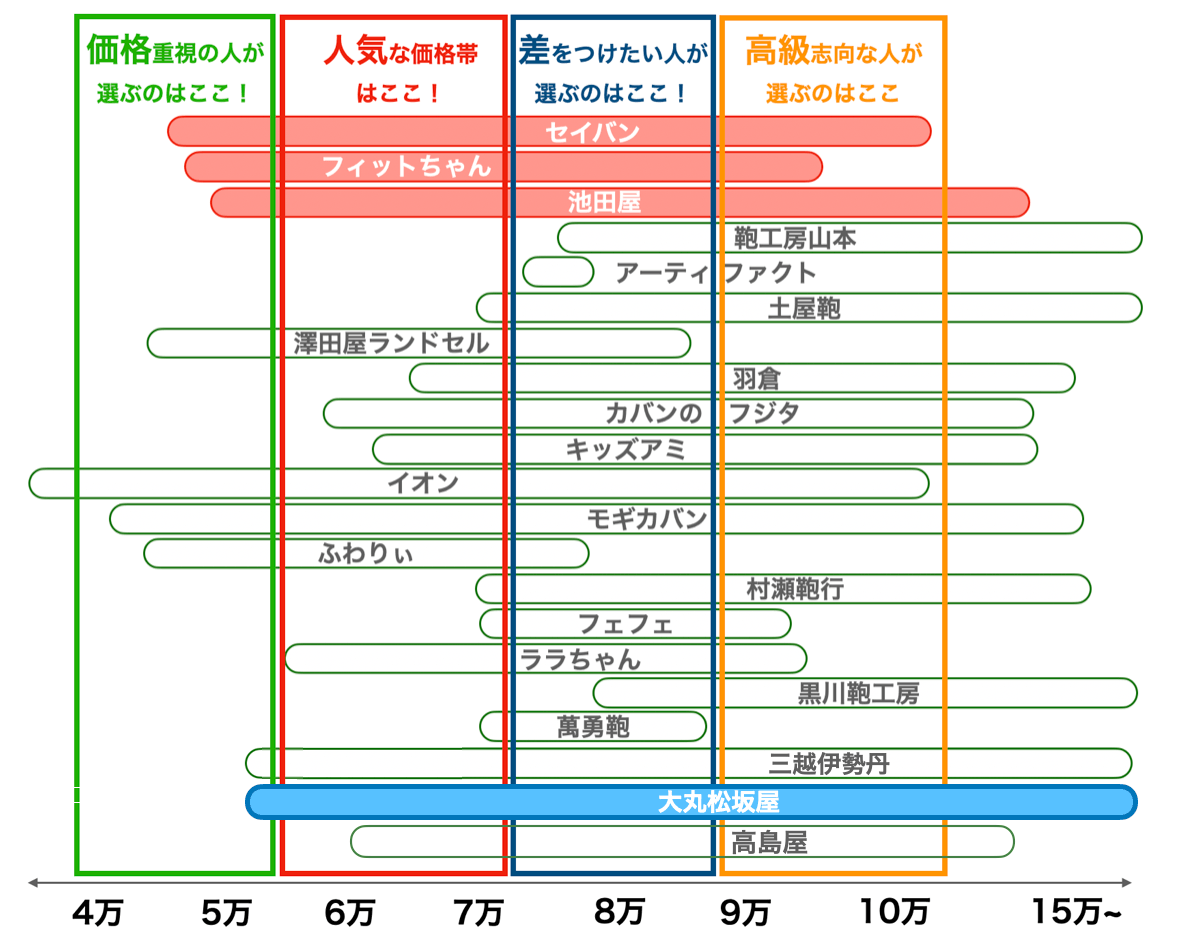 ちなみに、これらの百貨店やランドセルメーカー各社の値段を比較すると以下の通りです。
