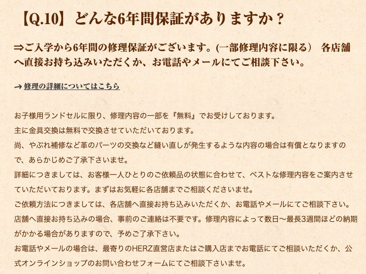 ヘルツ』のランドセルはあくまで数ある革かばん商品の1つという位置付けなので、他のランドセルに比べて保証内容は手薄です