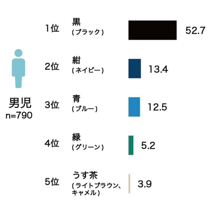 男の子に人気な色は定番の黒や紺などを中心に、青系そして、緑や茶色なども買われています。